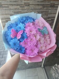 Buket je izrađen od punih hrizantema u plavoj i roze boji, pažljivo raspoređenih u poluloptasti oblik. Cvetovi su gusto složeni kako bi se dobio efekat luksuza i volumena.