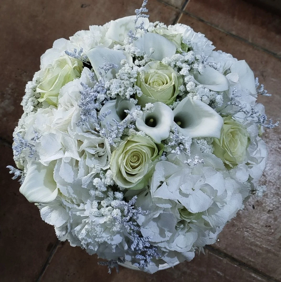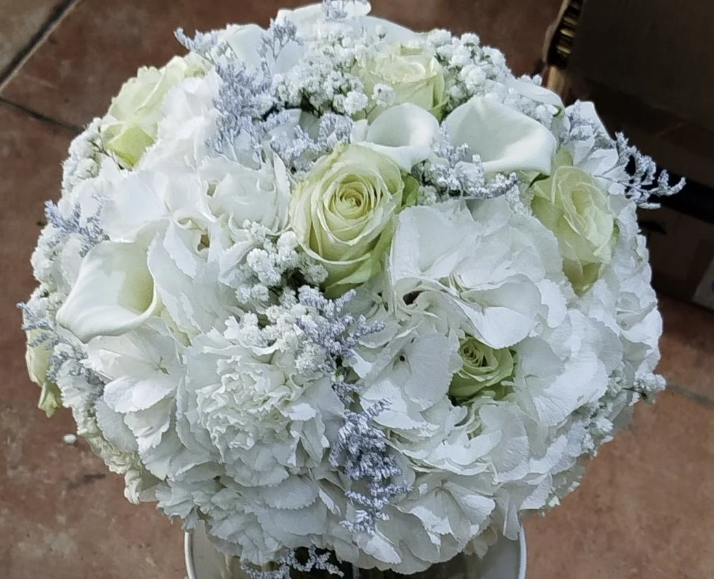 Ovaj bidermajer odiše elegancijom i čistotom, savršen za svaki trenutak kada želite da zasijate na svom posebnom danu. Bele ruže i kale, nežno ukomponovane sa hortenzijama, stvaraju nezaboravnu kombinaciju koja simbolizuje nevinost i večnu ljubav. Dodir gipsofile donosi romantičnu notu ovom raskošnom bidermajeru.